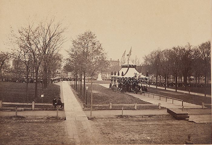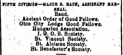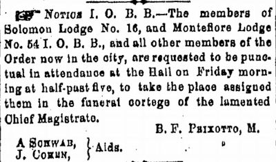 The funeral procession was organized into six divisions, each with an assistant marshal. The April 27, 1865 Plain Dealer story of organizations participating in the parade shows the I.O.B.B. (International Order of B'nai B'rith) in the fifth division, incorrectly listed as the I.O.O.B. Society. Each division would assemble on a different street. Bands were brought to Cleveland so each division would have one. Mayor George Senter's proclamation asked that restaurants be open to accommodate the many visitors, but all other businesses to close, that buildings along the parade route be draped in black, that no alcohol or ale be served, and that decorum be observed throughout the day. |