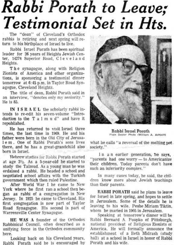 in Cleveland. Peshe Miriam Porath died, at age 87, in