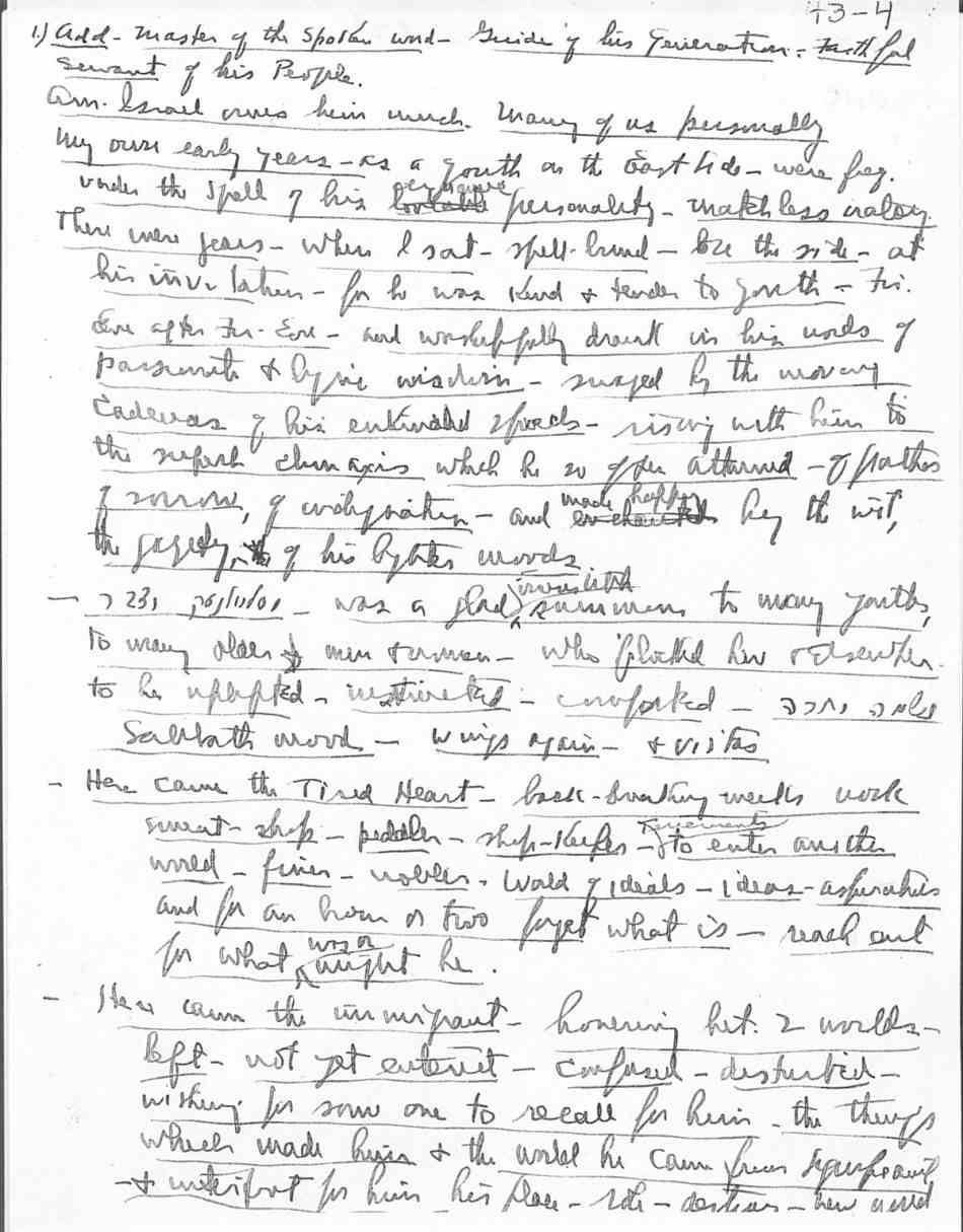On Thursday evening April 15, 1943 Rabbi Abba Hillel Silver spoke at the memorial service for Rev, Zvi Hirsch Masliansky. We show below images of the five pages of handwritten notes, made on the back of Commodore Hotel stationery, he made in preparation. Courtesy Western Reserve Historical Society. To see a restoration of most of the eulogy, click here. |
