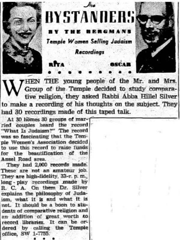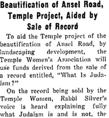 In 2016 an eBay search on "Abba Hillel Silver" found a treasure: a 10" long playing record created in 1954. Written and spoken by Rabbi Abba Hillel Silver, "What is Judaism" is a good sample of his teaching mode. There are no examples here of Silver at his most eloquent moments when he could inspire an audience and bring large crowds to their feet. Shown below is the story from the front page of the May 14, 1954 Jewish Independent that announces that the record is available for sale to benefit the beautification of Ansel Road. The project was The Temple's response to urban decay that had reached the western edge of its property. It bought and demolished some old buildings on the west side of Ansel Road and in their place created a well landscaped area that would protect The Temple and enhance its setting. In the summer of 1954 the area was named "Silver Park". Arnold Berger July 27,