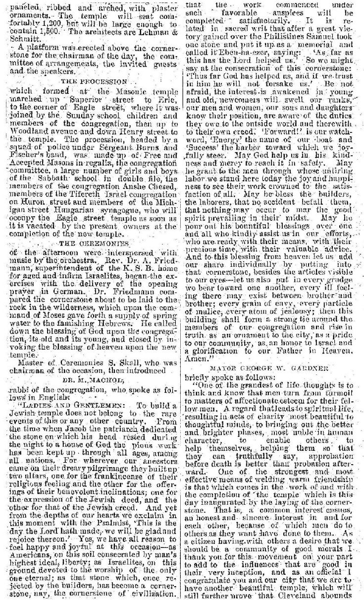 Epilogue Anshe Chesed Congregation would occupy its new building on Scovill Avenue just before the High Holy Days in 1887, less than a year after the cornerstone-laying ceremony described above. Cleveland was growing at an accelerating rate. The stream of immigrants from Southern and Eastern Europe that had begun after the Civil War became a great wave. Population more than doubled between 1890 and 1910: from 261,000 to 560,000. Immigrants moved into the old neighborhoods downtown and some to the near west side. More established families moved to newer neighborhoods away from downtown. Some went west of the Cuyahoga River, some south. Most who were east of the river kept moving east. With families of the 1880's and 90s having four or five children, the native-born Jewish population swelled We believe that most Jewish children stayed in Cleveland, married other Jews, and joined the shul in which they had been raised. (How different is that today for most of today's Reform Jewish grandparents.)