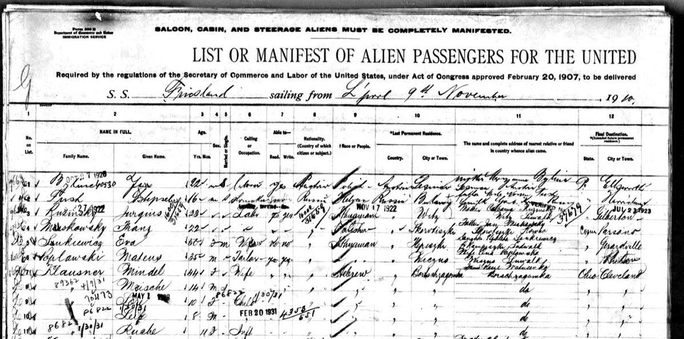 1910 ship's manifest page 1