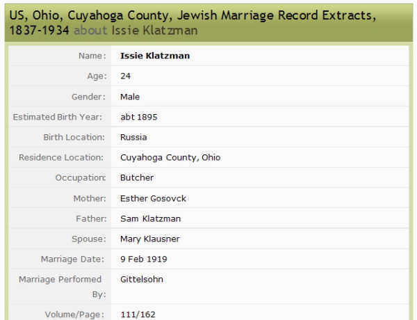 | The Klausners were active in the Tetiever Shul, but it did not have a rabbi until 1931. They engaged the Lithuanian-born Benjamin Gittelson (1853-1932), rabbi of Oer Chodosh Anshe Sfard from 1901-1932, to marry their daughter Mary to Issie Klotzman. Until 1925, when Rabbi Israel Porath, born and educated in Jerusalem, came to Oheb Zedek, Gittelson was the city's leading Orthodox rabbi and spiritual authority for many small congregations. |