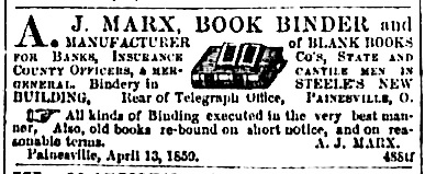 | 1860 advertisement for A. J. Marx Book Binder and manufacturer of blank books for banks, insurance companies, etc, in Painesville Ohio. |