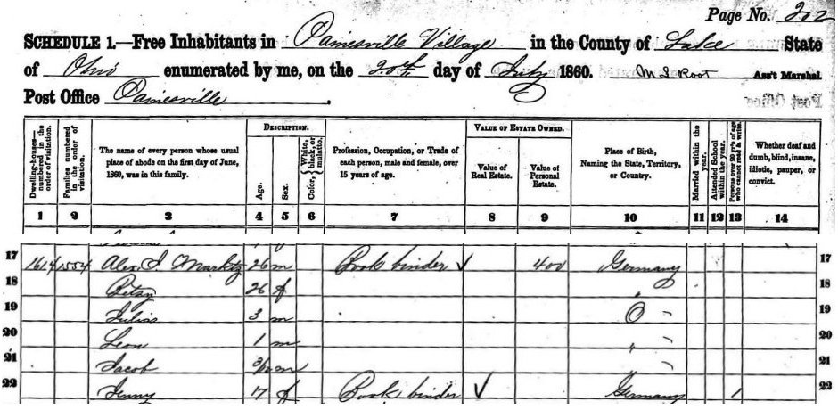 By the time of the 1860 census (see census form below) he was living in Painesville, Ohio and working as a bookbinder, an occupation he continued to work at until 1866, with an interruption of about 10 months when he volunteered to serve during the Civil War. Aaron’s sister Schanette/Jeanette/Jenny immigrated around 1855 and was living with Aaron and Bertha in Painesville. She was also a bookbinder and they probably worked together in Aaron’s shop, A J Marx Bookbinder and Manufacturer, which was located at the rear of the telegraph office in Painesville. Schanette was the only sibling of Aaron’s to immigrate. |