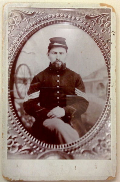 Erie. It appears the reason for the move to Erie was so that Aaron could enlist in the volunteer regiment of Co. F 169th Pennsylvania Regiment. He enlisted on October 16, 1862 when the regiment was organized. He was mustered out on July 25, 1863, two days before the rest of the regiment, due to a medical discharge. He entered at the rank of Sergeant. I believe this was due his ability to read and write English, which was not common at that time. He was honorably discharged. Below: Aaron Joseph Marx in his Army uniform with sergeant stripes. The picture is mounted on a postcard measuring 4.25” x 6.6”. |