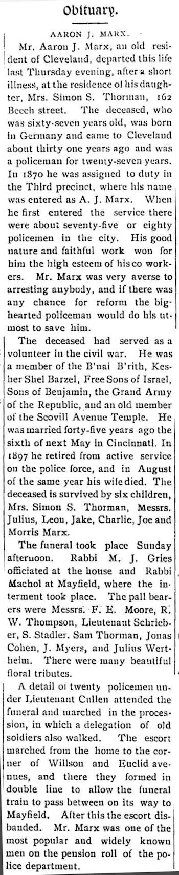 Obituary from the April 26, 1901 Jewish Independent. Aaron died from diabetes April 18, 1901 at the age of 67. He was at the home of his daughter and son-in-law, Hannah and Simon Thorman, at 162 Beech Street (today East 43rd Street). His death was reported in both Jewish newspapers: the Jewish Independent and the Jewish Review & Observer. The long obituary noted his aversion to arresting people if he thought there was a chance to reform them. He was described as one of the most popular and widely known men on the police pension roll. Rabbi Moses Gries of The Temple (Tifereth Israel), who had married a daughter of Kaufman Hays, officiated at the services at the home. The procession from the home to Willson Avenue (now East 55th) and Euclid Avenue included Civil War veterans and a police honor guard. The mourners and the coffin traveled on the special funeral streetcar that served Lakeside and Mayfield cemeteries. It traveled east on Euclid Avenue, then up Mayfield Road. There Rabbi Michaelis Machol of the Scovill Avenue Temple (Anshe Chesed) officiated at services at the Mayfield Cemetery Chapel. Aaron was survived by six sons and a daughter. With the exception of his son Charles (my great grandfather), all of his children remained in Cleveland.
