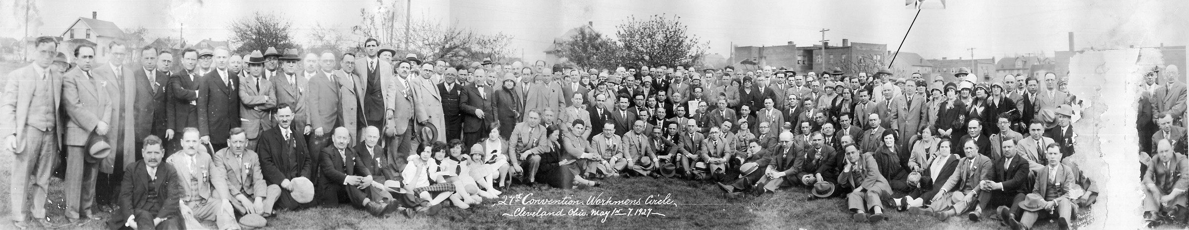 In the 1920s large groups often posed for panoramic photos. On Sunday May 1, 1927, in the early afternoon, near Masonic Hall on the northeast corner of Euclid Avenue and East 36th Street, those who would be attending the national convention's opening session at 3 pm assembled for a group picture. Luckily, this 37 inch by 10 inch treasure has survived, but not well as it had been stored for more than 90 years, rolled up and unprotected from light. The vertical lighter bands show the fading that resulted. I created the image by stitching together scans of its left, center and right. The right-of-center line points to the only delegate who has been identified: Max Koblentz (1885-1971), who came to Cleveland in 1908, worked as a carpenter and union organizer and was a long-time Workmen's Circle leader.