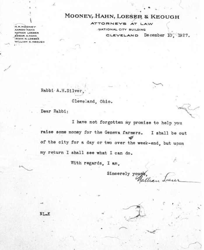 December 10, 1927 Letter from Nathan Loeser to Abba Hillel Silver Nathan Loeser served as president of Anshe Chesed, then the Euclid Avenue Temple and today Anshe Chesed Fairmount Temple.. Named Partner Edgar Hahn was the son of Rabbi Aaron Hahn who left The Temple in 1892 to practice law. Today the firm Hahn + Loeser has offices in six cities. |