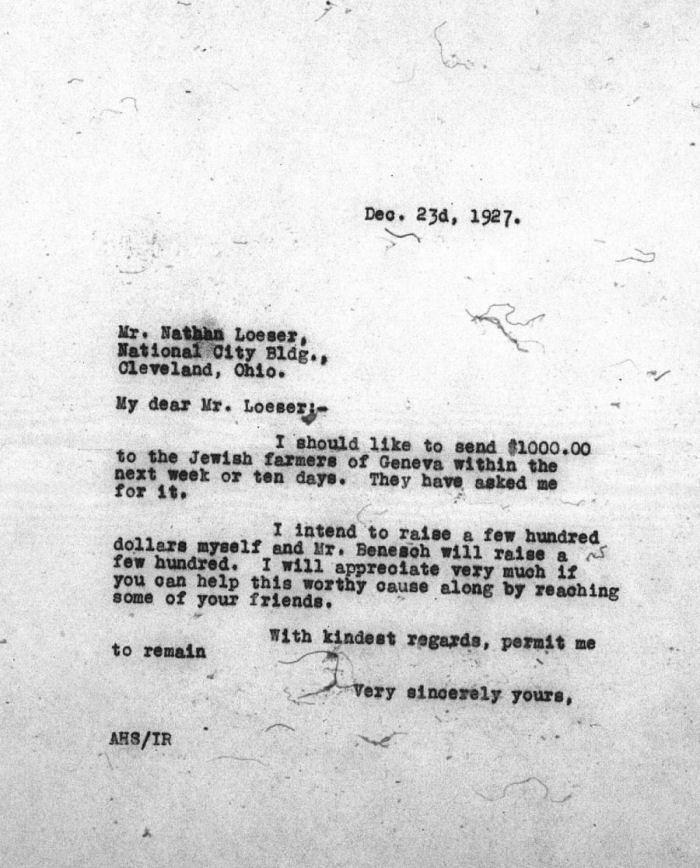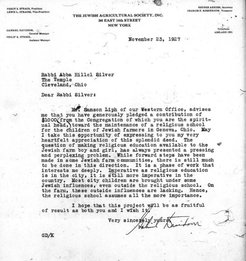 November 23, 1927 Letter from The Jewish Agricultural Society to Rabbi Silver The JAS was supported by (Baron) Maurice de Hirsch, who had made his fortune building the Orient Express Railway in southeast Europe. Samson Liph and Gabriel Davidson attended and spoke at the Geneva banquet. |