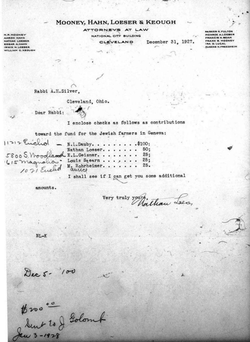 December 31, 1927 Letter from Nathan Loeser to Rabbi Silver Nathan Loeser sends his own check and those of four others, |