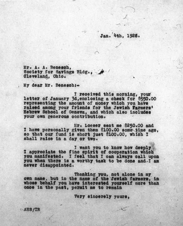 January 4, 1928 Letter from Rabbi Silver to Alfred Benesch Attorney Alfred Benesch was a Temple trustee. We believe that he knew Silver from B'nai Brith activities and in 1917 brought him to the attention of The Temple trustees who, on hearing him speak offered him the pulpit of The Temple. |