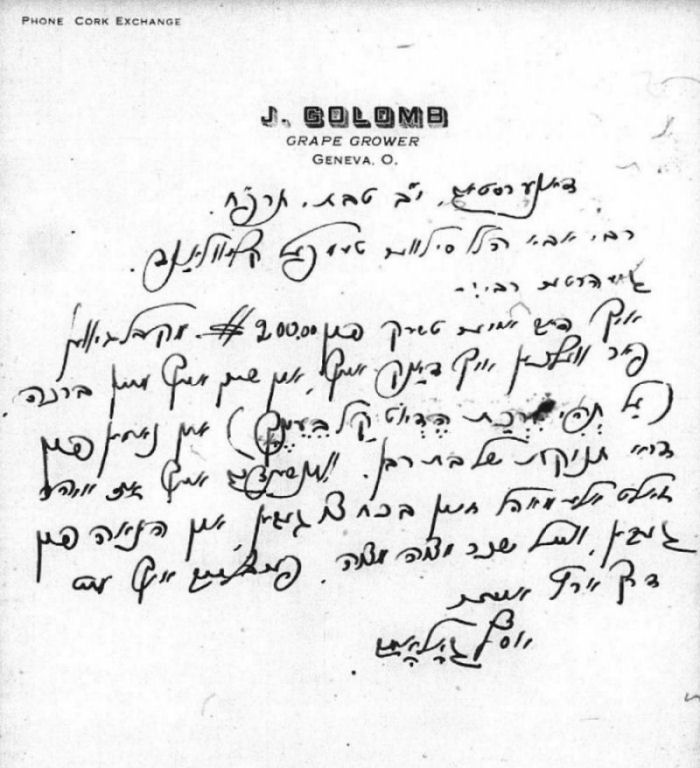 January 5, 1928 Letter from Joseph Golomb to Abba Hillel Silver Geneva grape grower Joseph Golomb's letter of thanks is in Yiddish and Hebrew and is dated 12 Tivet 5688. Yiddish was Lithuanian-born Silver's first language and was spoken in his family home on New York's Lower East Side. |