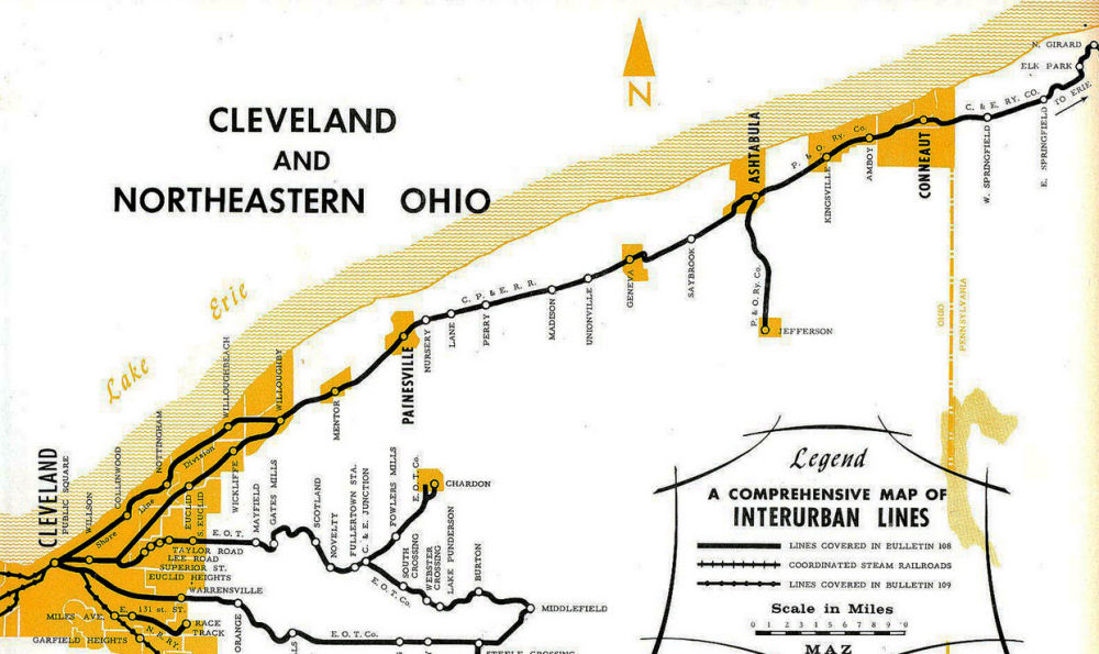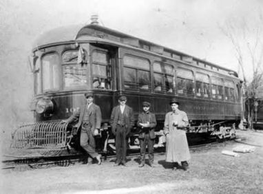 Interurban lines ran electric powered streetcars, modified to serve far outside city limits. As shown in the 1910 photo of a Medina interurban, they could be equipped to move obstacles and animals off the track. Many had wider doors and space inside for freight. Geneva was a stop on the interurban when they were important in the 1920s. On them people, produce, even chickens, could move from farm to town or city. Farm families could shop in Cleveland; on a large purchase the merchant might pay the cost of the trip. With the great increase of car ownership in the 1920s and building of public highways, interurbans soon went out of business. A note to historically-minded Clevelanders: when you get on a light rail line such as the Shaker Rapid or a "rapid" from downtown to the airport, remember the interurbans. Prelude