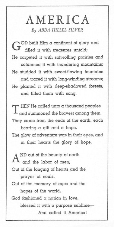 Though the Abba Hillel Silver archives have poems he wrote in 1910 and 1911 while an undergraduate at the University of Cincinnati, only this poem, "America", probably composed in 1923, seems to have had much exposure.