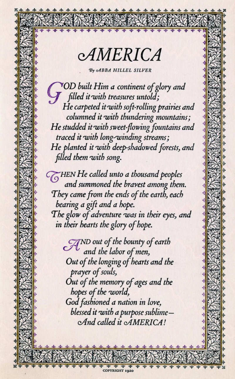 This patriotic poem praises our nation and the brave immigrants who came here. Rabbi Silver may have written it as a way to push back at the growing anti-immigrant sentiment and increasingly restrictive immigration policies of the early 1920s. He too was an immigrant, having come here in 1902 as a boy of nine. It is a poem of praise, without criticism, yet it ends with mention of a purpose sublime which, to me, suggests that there is more to be done.