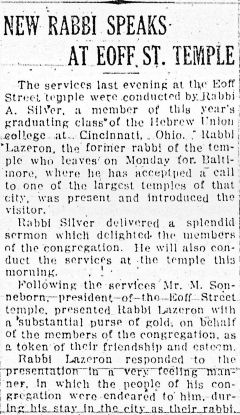 at Eoff Street Temple and "delivered a splendid sermon".