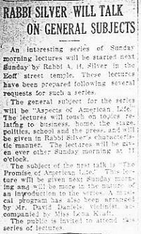 "The general subject for the series will be Aspects of American Life. The lectures will touch on topics related to business, home, the stage, politics, school and the press and will be given in Rabbi Silver's characteristic manner."