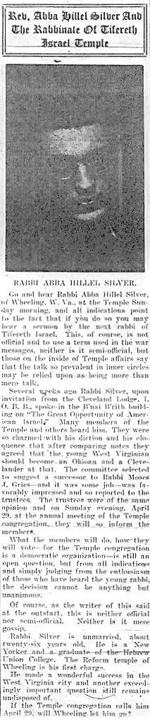 On April 20, nine days before the Temple annual meeting when the selection would be announced, the front page of the Jewish Independent reported unofficially (but confidently) that the decision to select Abba Hillel Silver had been made soon after February 24 B'nai B'rith speech. The story ends with the question "Will Wheeling let him go?"