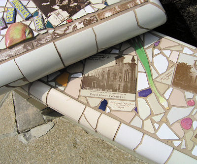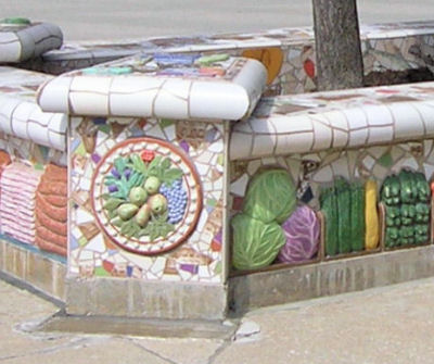 about the Gateway Plaza Planter Located on East Sixth Street at Gateway Plaza, just outside "The Q", the 25-foot by 7-foot planter bench was completed in 1994. It is the collaborative work of two Cleveland artists: ceramic artist Angelica Pozo and art photographer Penny Rakoff. Absolute Flooring & Tile Inc. produced the piece on location with the artists' assistance. From this Plain Dealer page. The bench is one of several pieces of outdoor public art at the Gateway complex paid for through donations and private funding and coordinated by the nonprofit group Cleveland Public Art. |